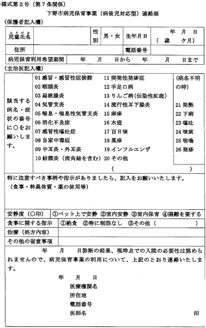 □ 下野市病児保育事業(病後児対応型)連絡票